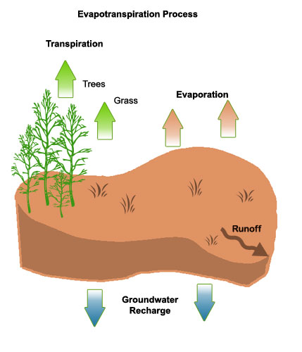 | The term Evapotranspiration (ET) combines the concepts of evaporation (E) from soil and plant surfaces with transpiration (T) from plant leaves to describe the total water escaping from a crop to the air. Evapotranspiration increases with: higher air temperature, more solar (light) energy, lower humidity, and faster wind speed. Evapotranspiration is often referred to as "crop water use" because the two processes are so closely entwined and difficult to separate. Irrigation Scheduling:The Water Balance Approach, CSU Fact Sheet 4.707